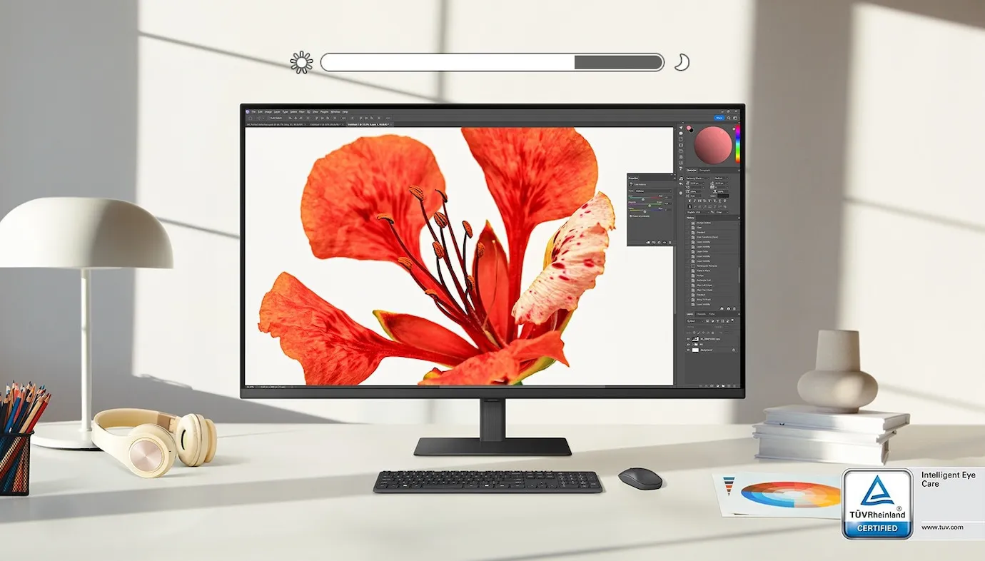 Långa arbetspass kräver en ergonomisk display som tänker med och skyddar din hälsa. Samsungs 37-tums UHD-monitor är TÜV-certifierad för sin höga ögonkomfort och syftar till att avsevärt minska visuell trötthet. Kärnan är Intelligent Eye Care-tekniken. Den anpassar skärmens ljusstyrka och färgtemperatur automatiskt efter omgivningsljuset, vilket eliminerar störande ljusstyrkeförändringar. Denna adaptiva bildjustering skonsar ögonen och gör att du kan koncentrera dig på krävande uppgifter som programmering eller finstilt design i timmar. Ergonomin börjar redan vid monteringen: Den innovativa Easy Setup-stativet gör det möjligt att installera skärmen snabbt och enkelt. Även under drift övertygar ViewFinity S7 med effektiva funktioner som Auto Source Switch+. Skärmen känner automatiskt av den aktiva källan och växlar själv till rätt ingång, vilket gör besvärlig manuell omkoppling överflödig och håller ditt arbetsflöde smidigt. Detta skapar en smidig, uppstädad och ergonomisk arbetsplats.