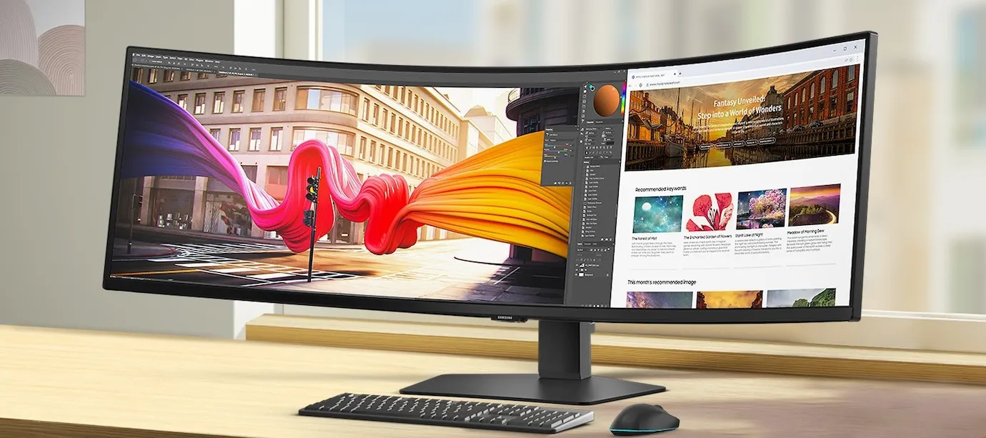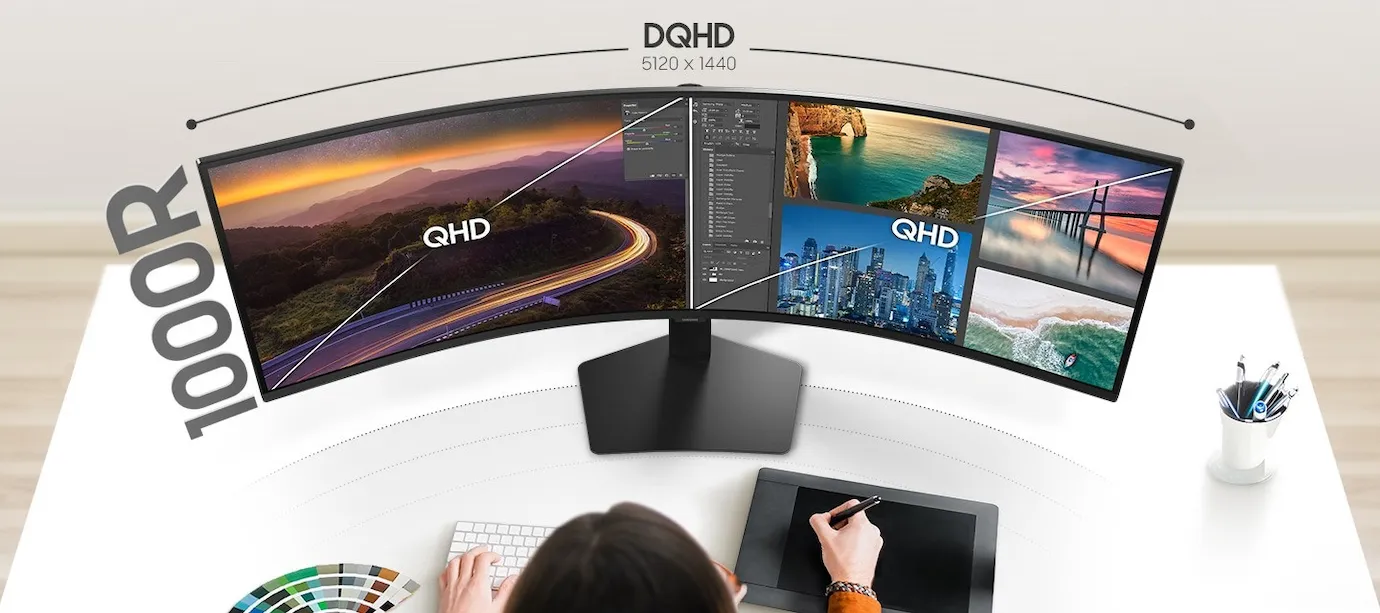 - DQHD 5120x1440: Det sömlösa 49-tums displayet ersätter två monitorer och erbjuder en gigantisk yta för alla applikationer.